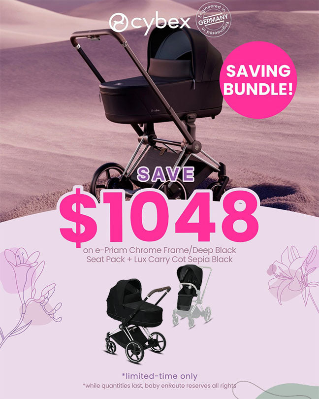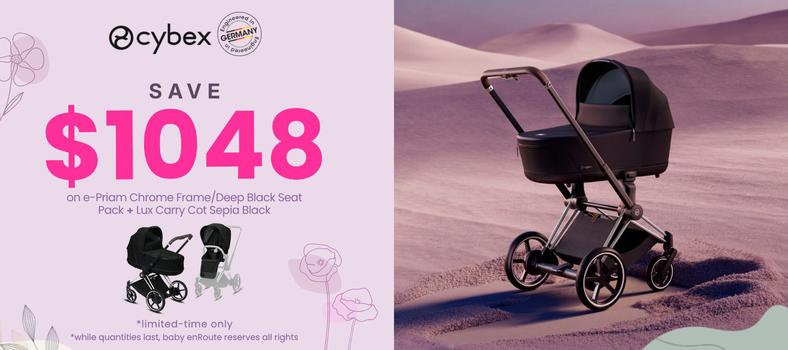 CYBEX e-Priam Chrome Frame/Deep Black Seat Pack + Lux Carry Cot Sepia Black Saving Bundle