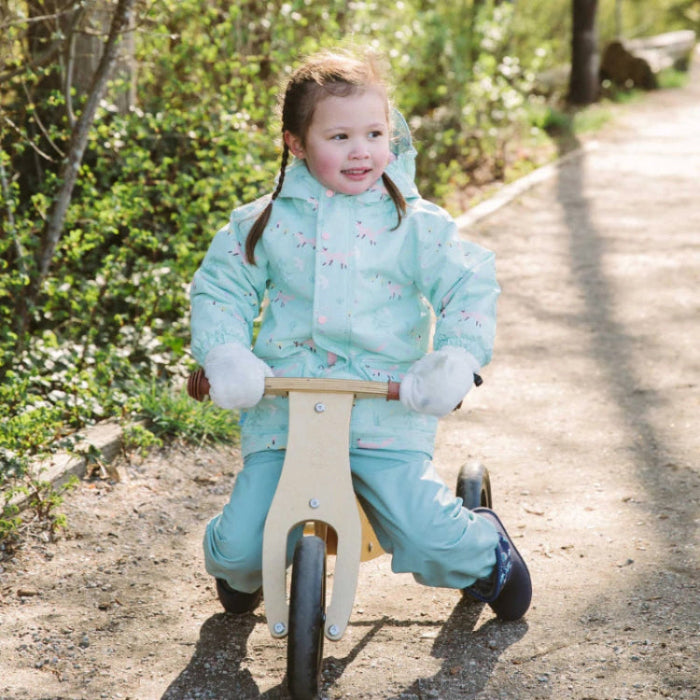 Pair these rain pants with cozy layers and a rain jacket for an all-weather outfit. Their soft dusty mint color works well in gender-neutral nurseries and follows sustainable, minimalist fashion trends for children’s outerwear.