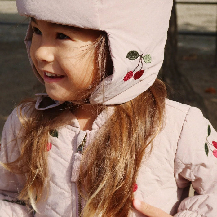 Keep your little one cozy and stylish with this charming bomber jacket featuring playful cherry embroidery, perfect for chilly days in the changing seasons with the Konges Slojd Juna Bomber Jacket Twilight Mauve.
