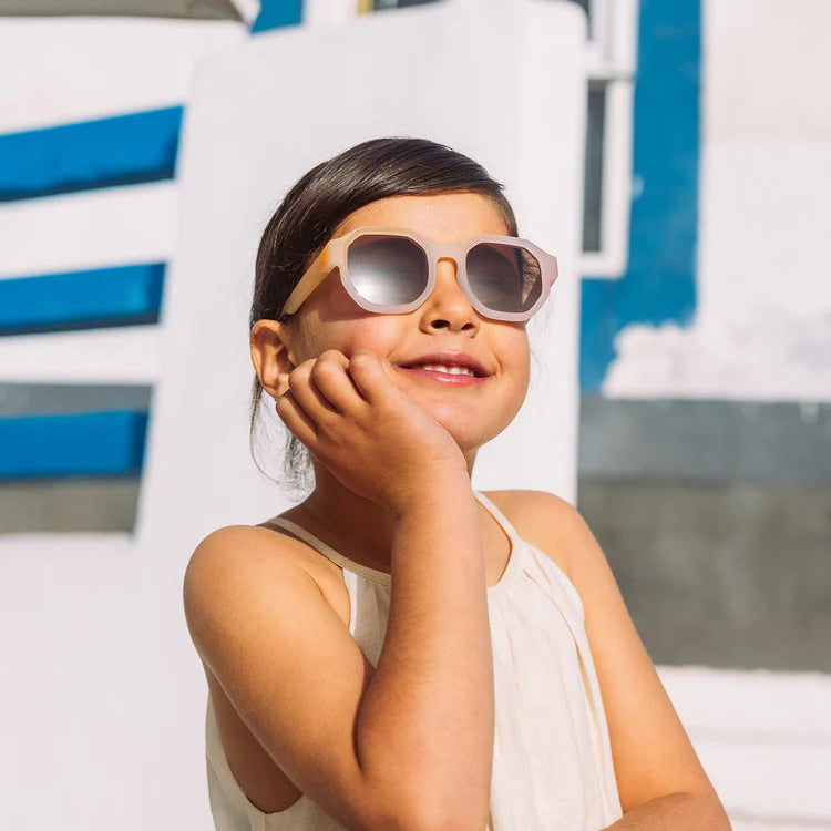 Pair these sunglasses with casual summer outfits or beachwear to complete a minimalistic and modern look. Their neutral pastel tones fit well with gender-neutral styles and sustainable fashion choices, making them a versatile accessory for any child’s wardrobe.