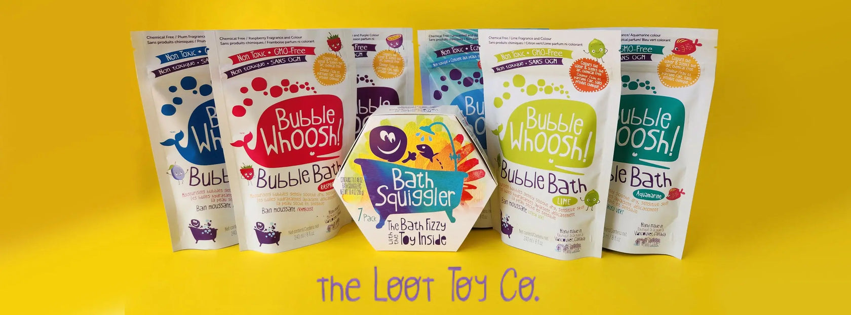 LOOT TOY CO. makes clean, safe bath products for kids—foam soap, bath fizz, and coloring tablets.