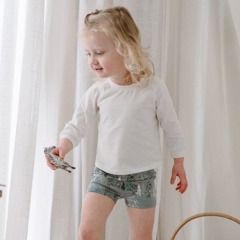 These bamboo boy shorts fit seamlessly into any child’s wardrobe and are perfect for layering under dresses or pants. Embrace minimalist and eco-conscious parenting by choosing sustainable fabrics like bamboo that respect sensitive skin. The charming forest print is gender-neutral and complements various nursery themes.