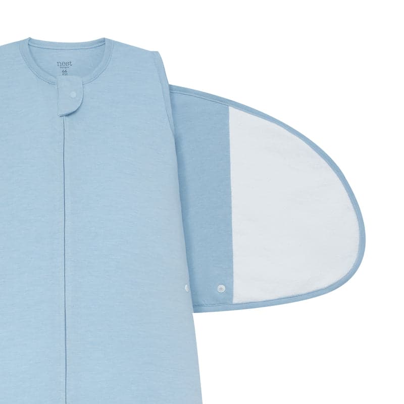 This swaddle sleep bag fits seamlessly into your nursery’s minimalist aesthetic with its soft blue shade and clean lines. It complements a gender-neutral space emphasizing sustainability, thanks to its eco-friendly bamboo fabric. Use it for naps or bedtime to ensure consistent comfort all year round.